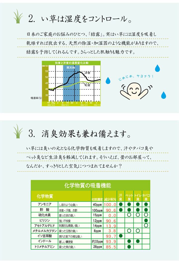 お部屋に敷きやすいカジュアルない草ラグです。裏面には滑りにくい加工をした不織布を使用しているため、フローリングにも最適です。い草には空気の自然浄化作用、湿度の調節作用などがあります。い草に青森ヒバ加工を施しています。(抗菌、防臭効果)
