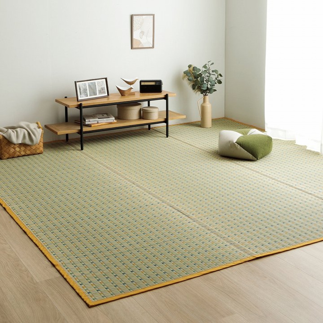 ■和室にも洋室にも合わせやすいデザインのい草ラグです。